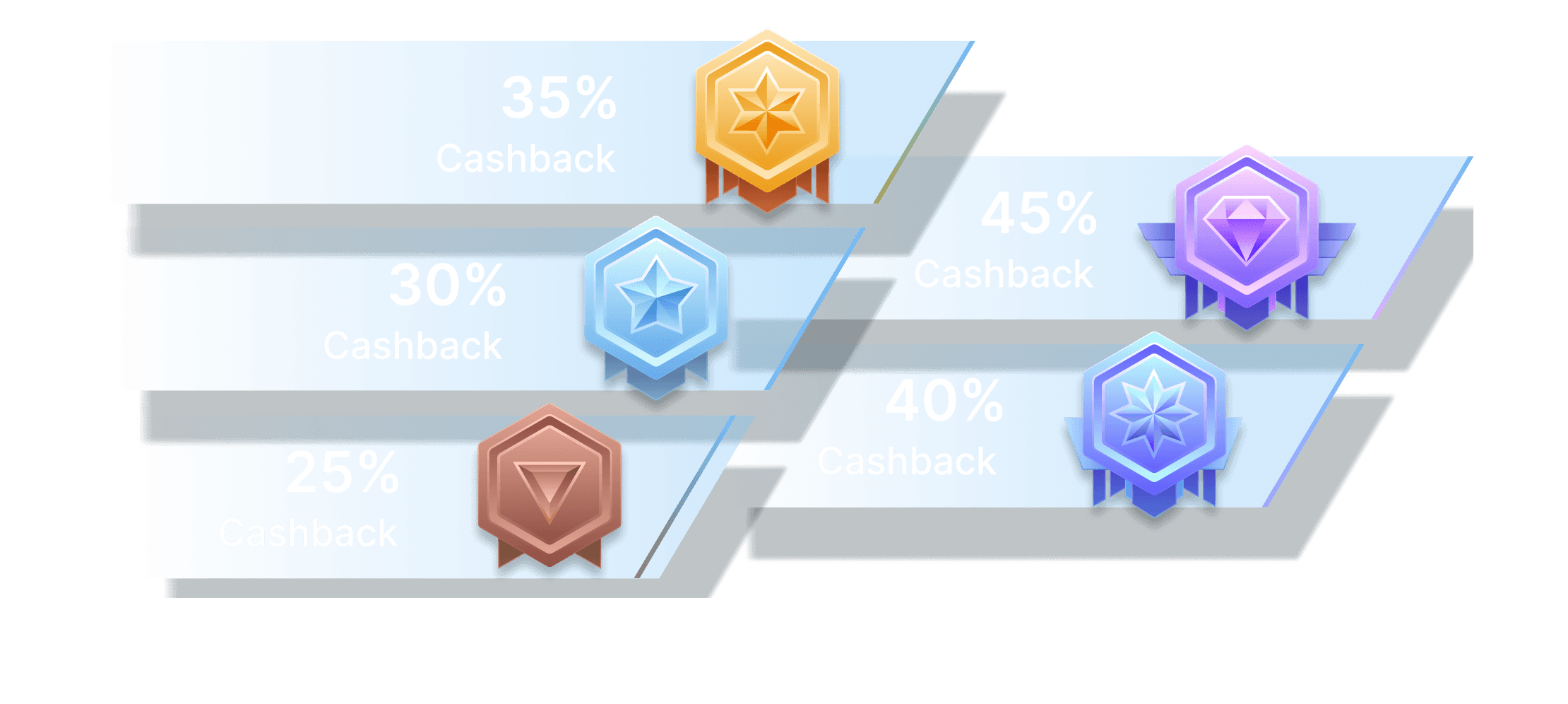45% cashback rate, highest in the market. Progress through ranks to unlock higher reward rates.
